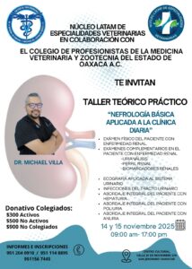 Oaxaca de Juárez, 10 de noviembre. Con la finalidad de impartir, enseñar e intercambiar conocimientos y técnicas sobre cómo afrontar las enfermedades de nefro renales en perros y gatos, el Núcleo Latam de Especialidades Veterinarias en colaboración con el Colegio de Profesionistas de la Medicina Veterinaria y Zootecnia del Estado de Oaxaca A.C., invitan a los médicos veterinarios de Oaxaca y de otros estados a participar en el curso-taller sobre “Nefrología Básica Aplicada a la Clínica Diaria”.