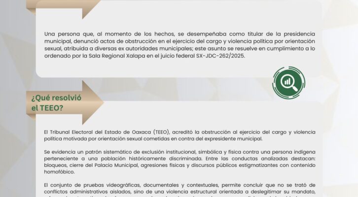 Huajuapan de León, Oax. 3 de diciembre. En Sesión Pública presencial, el Tribunal Electoral del Estado de Oaxaca (TEEO), acreditó obstrucción al cargo y violencia política motivada por orientación sexual cometida en contra del expresidente...