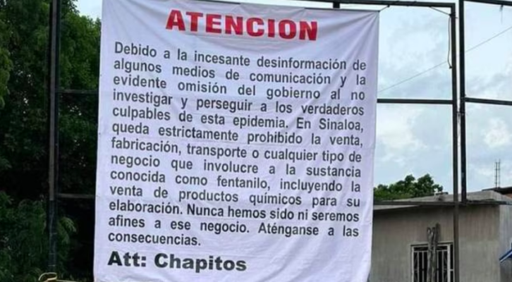 “Atención: Debido a la incesante desinformación de algunos medios de comunicación y la evidente omisión del gobierno al no investigar y perseguir a los verdaderos culpables de esta epidemia. En Sinaloa, queda estrictamente prohibido la venta, fabricación, transporte o cualquier tipo de negocio que involucre a la sustancia conocida como fentanilo, incluyendo la venta de productos químicos para su elaboración”, indica el texto.