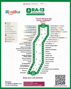 El primer recorrido RA-13 “Waxin”, que en náhuatl de Santa María Teopoxco significa guaje, enlaza la terminal Yuroo Parque del Amor “Ladxidó” con la agencia de policía San Luis Beltrán de Oaxaca de Juárez. Su recorrido cuenta con 55 paradas autorizadas, de las cuales 27 son de ida y 28 de regreso.