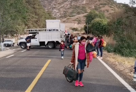 En el bloqueo de la vía Huajuapan-Oaxaca, a la altura de la desviación a Tezoatlán, se encuentra un grupo de personas que supuestamente fueron desplazadas de San Andrés Yutatio, quienes a través de las pancartas que portaban, pedían el retorno seguro a su comunidad.