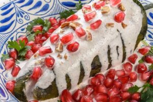 Creado en Puebla, este platillo combina lo dulce de la nogada con lo salado del chile poblano relleno de carne guisada con pasas y otros ingredientes; una fusión que se convierte en toda una experiencia culinaria que solo se encuentra una vez al año.