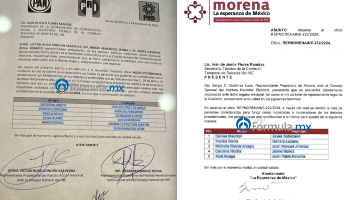 Oaxaca de Juárez, 2 de marzo. En atención a lo requerido mediante oficio INE/ST-CTD/008/2024, por el Consejo General del instituto Nacional Electoral, representantes de los partidos políticos nacionales Acción Nacional, Revolucionario Institucional y de la Revolución Democrática que integran la coalición Fuerza y Corazón por México, proporcionaron un listado de personas que pudieran ser consideradas como Moderadores y/o Moderadoras en los debates presidenciales que se realizaran los días 7, 28 de abril y 19 de mayo del presente año.