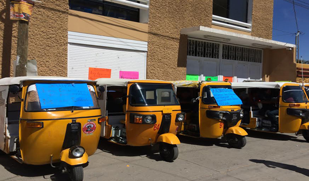 Oaxaca de Juárez, 8 de febrero. Mototaxistas del Frente Popular 14 de Junio, demandaron en la Secretaría de Vialidad y Transporte (Sevitra), que se respete el proceso que llevan a cabo de regularización de sus unidades.
