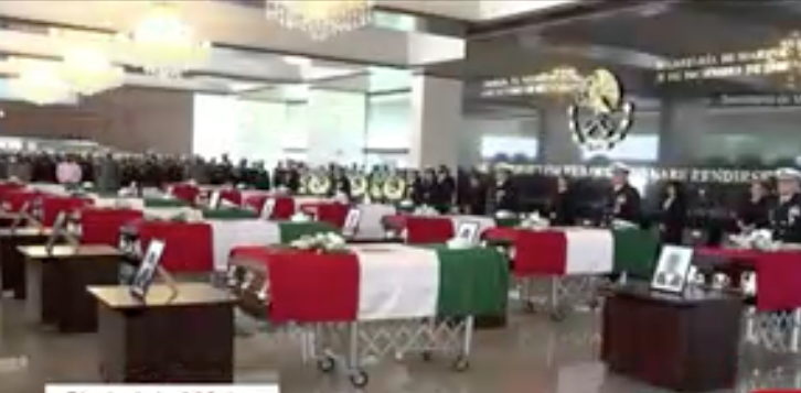 Cada uno de los 14 ataúdes fue cubierto por una bandera mexicana.
