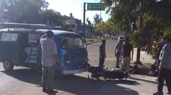 Huajuapan de León, Oax. 19 de octubre. Daños materiales y dos personas lesionadas dejó el choque entre una motocicleta y una combi.