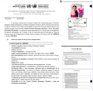 Obvio en los numerales posteriores la ONU hace referencia a la actividad de lucha en favor de los Derechos Humanos que Sandra Domínguez hacía en comunidades indigenas de Oaxaca y también se ocupa de los señalamientos que ella misma hizo en contra de servidores públicos que bien pueden estar involucrados en su desaparición.