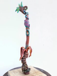 Diana Roque, reveló que el cetro lo elaboró en soporte orgánico de madera, además de que fue una intervención de un tronco de mezquite, árbol originario de la región Mixteca.