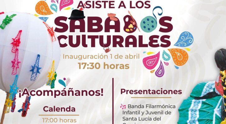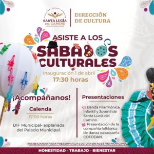 Por este motivo, se desarrollará una calenda a las 17 hrs. que saldrá de las instalaciones del DIF municipal con dirección al palacio municipal por ello se invita a las familias de Santa Lucía del Camino a la inauguración de “Sábados Culturales”, este sábado 1 de abril a las 17:30 horas, en la explanada municipal, donde estará presentándose la Banda Filarmónica Infantil y Juvenil del municipio, así como la compañía folklórica de danza oaxaqueña COFODAN.