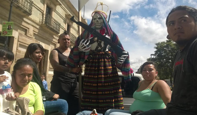 Oaxaca de Juárez, 2 de noviembre. Un grupo de personas llevó a cabo una calenda que recorrió calles de la ciudad para manifestar su devoción a la Santa Muerte, a la que le atribuyen milagros que realiza a quienes se lo solicitan.