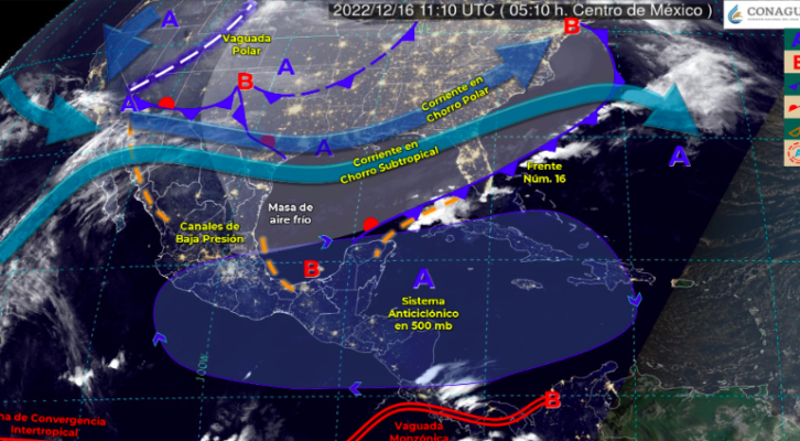 Oaxaca de Juárez, 16 de diciembre. Este día, el frente Núm. 16 se extenderá con características de estacionario sobre el sur y centro del Golfo de México, en interacción con un canal de baja presión sobre el occidente de dicho golfo, ocasionarán lluvias puntuales fuertes en Chiapas y Tabasco, chubascos dispersos en Nuevo León, Tamaulipas, Puebla, Veracruz, Oaxaca y la Península de Yucatán; así como lluvias aisladas en San Luis Potosí. La masa de aire frío asociada al frente, continuará generando ambiente frío a muy frío, durante la mañana y noche, sobre la Mesa del Norte, la Mesa Central y el oriente del territorio nacional; heladas al amanecer, además de bancos de niebla sobre la Sierra Madre Oriental. Por otra parte, la corriente en chorro subtropical y la proximidad de una vaguada polar, originarán vientos fuertes con tolvaneras en el noroeste y norte del país; lluvias aisladas en Sonora, Chihuahua y Coahuila, además de posible caída de nieve o aguanieve en las sierras de Sonora y Chihuahua. Finalmente, una circulación anticiclónica mantendrá baja probabilidad de lluvia en el occidente, centro y sur de la República Mexicana.