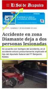 Oaxaca de Juárez, 1 de noviembre. Un hombre y una mujer resultaron lesionados tras el choque de dos vehículos, uno de ellos, del hijo del diputado federal del PT por Oaxaca, Benjamín Robles, en la zona Diamante de Acapulco.