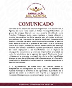 Oaxaca de Juárez, 27 de abril. En referencia a los hechos en la Agencia de Santa María Ixcotel, el ayuntamiento emite el siguiente comunicado: