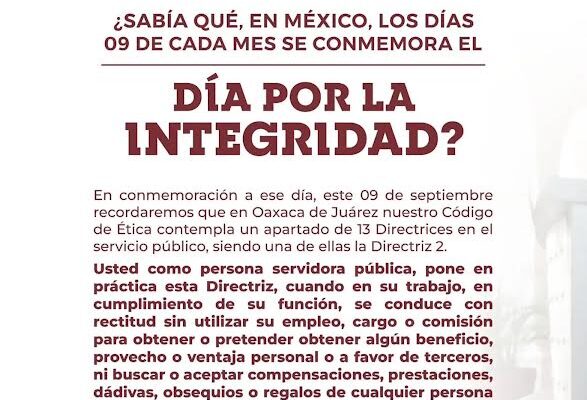 Oaxaca de Juárez, 5 de septiembre. En conmemoración del “Día por la Integridad”, celebrado cada 9 de septiembre, el Ayuntamiento de Oaxaca de Juárez, reafirma su compromiso con la ética, la transparencia y la integridad en el servicio público.