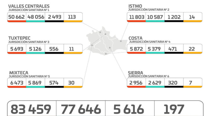 Por Jurisdicción Sanitaria, Valles Centrales contabiliza 50 mil 662 confirmados, 113 activos y dos mil 493 defunciones; Istmo 11 mil 803 confirmados, 14 activos y mil 202 decesos; Tuxtepec cinco mil 693 confirmados, 11 activos y 556 defunciones; Costa cinco mil 872 confirmados, 22 activos y 471 defunciones; Mixteca seis mil 473 confirmados, 30 activos y 574 decesos; Sierra dos mil 956 confirmados, siete activos y 320 decesos.