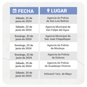 - Sábado 29 de junio: Agencia de Policía de Guadalupe Victoria / Infonavit 1ero de Mayo.
