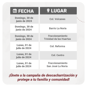A través de la Secretaría de Servicios Municipales se dará inicio esta campaña el próximo sábado 8 de junio en las agencias municipales Pueblo Nuevo y Trinidad de Viguera, en punto de las 8:00 horas, para fomentar la limpieza de los entornos, el cuidado a la salud y la seguridad de las y los ciudadanos.
