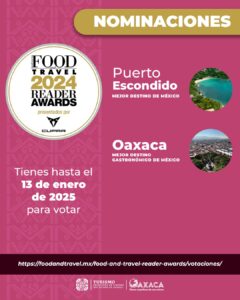 La dependencia informó que, en esta edición, Puerto Escondido está nominado como Mejor Destino de México, y Oaxaca como Mejor Destino Gastronómico de México, además de múltiples restaurantes, hoteles y experiencias turísticas; ubicadas en el estado.