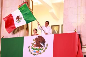Jara Cruz recibió la Bandera Nacional de manos de la Escolta del Ejército Mexicano. Posteriormente, repicó la campana -símbolo del llamado a la lucha independentista- y ondeó el Lábaro Patrio, que fue respondido con el júbilo de las y los presentes.