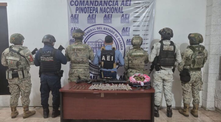 Fiscalía de Oaxaca, Marina, DEFENSA y Guardia Nacional aseguran lanza granadas, “cuerno de chivo” y droga tras operativo en la Costa (11:30 h)