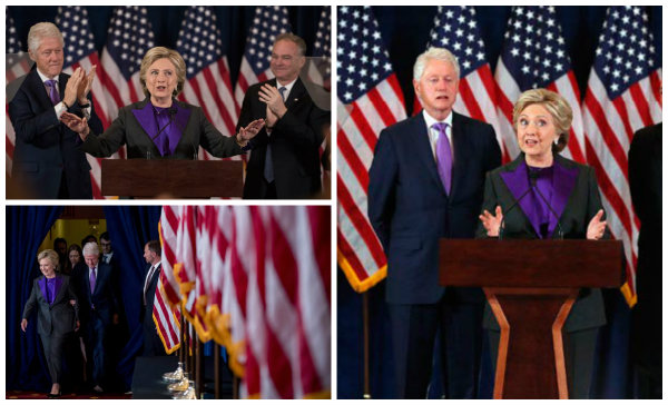Oaxaca de Juárez, 11 de noviembre. Hillary Clinton dio su discurso de derrota (Concession speech) vestida de morado, un look inusual durante su campaña. Eligió un traje gris oxford con la solapa del blazer a juego con una blusa de raso color morado.