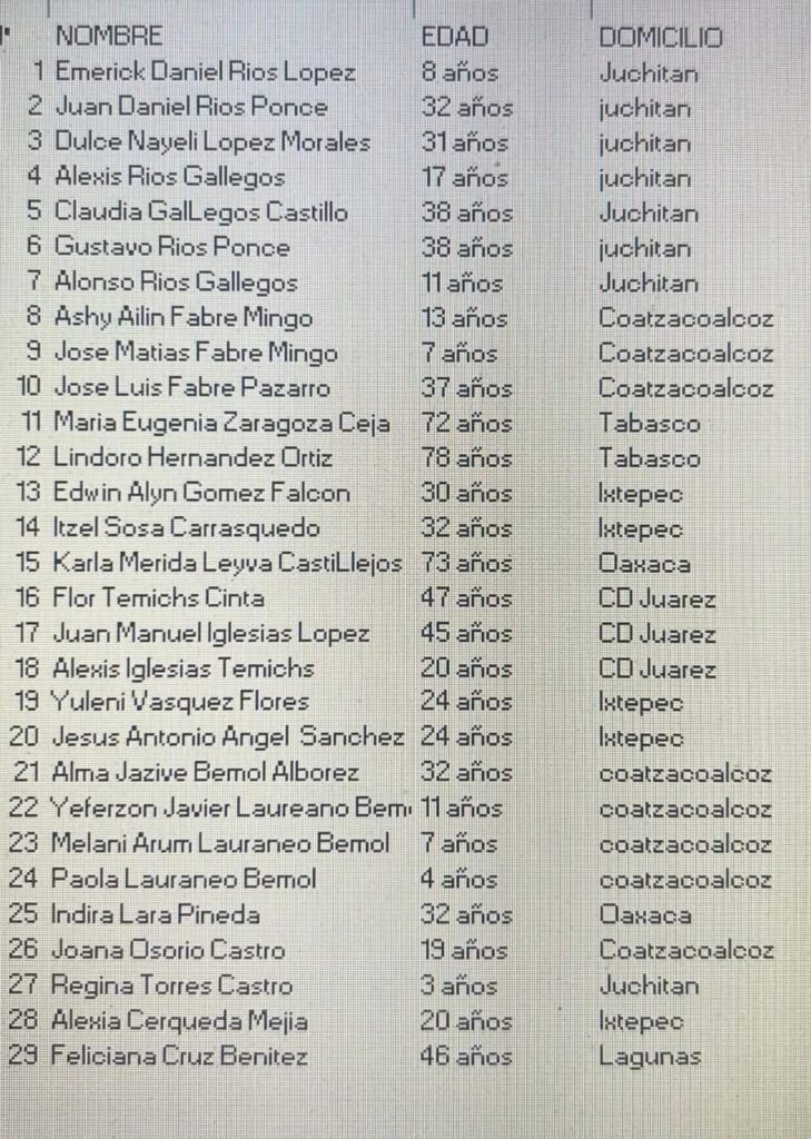 Oaxaca de Juárez, 28 d diciembre. Circulan en redes nombres de los pasajeros lesionados por el descarrilamiento del Tren Interoceánico en el Istmo de Tehuantepec y que están siedno atendidos en diverso s hospitales de la región.