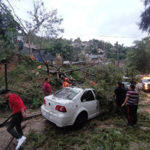 Oaxaca de Juárez, 6 de octubre. Luego de la tormenta que se registró esta tarde en la capital oaxaqueña reportan la caída de árboles en San Martín Mexicapan, Lomas de Santa Rosa, que impactó dos vehículos