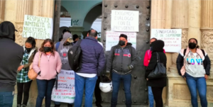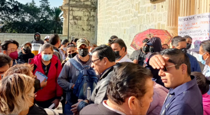 Oaxaca de Juárez, 25 de enero. Ante la protesta de trabajadores del Sindicato 12 de Septiembre quienes insisten en tener diálogo directo con el presidente municipal, Francisco Martínez Neri para plantearle asuntos relacionados a cuestiones laborales fueron atendidos por Felipe Canseco, secretario de Gobierno Municipal.