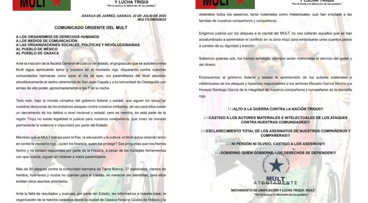 Huajuapan de León, Oax. 23 de julio. El coordinador estatal del Movimiento de Unificación y Lucha Triqui (MULT), Octavio de Jesús Díaz, comunicó que alrededor de las 7 de la noche del lunes 21 de julio paramilitares del Movimiento de Unificación y Lucha Triqui Independiente (MULTI), dispararon contra las comunidades de San Juan Copala y Cieneguilla.