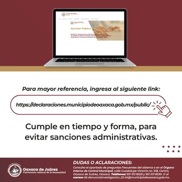 Oaxaca de Juárez, 24 de abril. El municipio capitalino hace un llamado para que las personas servidoras públicas sin distinción de nivel de cargo presenten su declaración de modificación patrimonial y declaración de posible conflicto de interés.