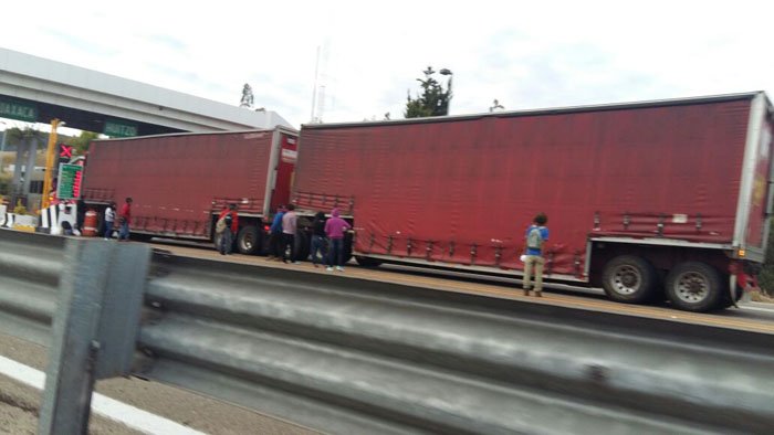 Desde temprana hora, los futuros maestros llegaron a la caseta de Huitzo y la tomaron. Exigen dinero a transportistas y saquean camiones de carga. Policía Federal lo permite (foto redes sociales)