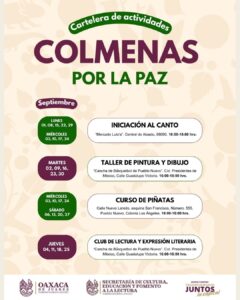 Oaxaca de Juárez, 5 de septiembre. El Gobierno Municipal de Oaxaca de Juárez, a través de la Secretaría de Cultura, Educación y Fomento a la Lectura, invita a las vecinas y vecinos de la capital a participar en la cartelera de actividades de Colmenas por la Paz, un espacio de encuentro comunitario que promueve la convivencia, la creatividad y el aprendizaje colectivo.