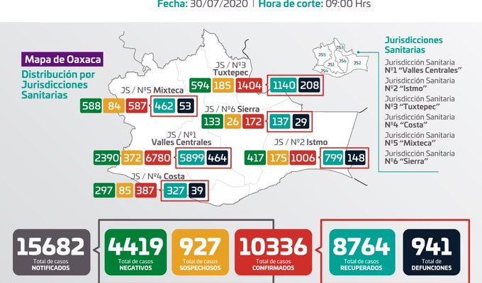 Dio a conocer que en la Jurisdicción Sanitaria número uno, Valles Centrales se han contabilizado, 6 mil 780 casos confirmados, de éstos, se han recuperado 5 mil 899 personas y se han presentado 464 defunciones; Tuxtepec presenta mil 404 casos, mil 140 recuperados y 208 defunciones; el Istmo presenta mil 006 casos, hay 799 recuperados y 148 defunciones; mientras que la Mixteca presenta 587 casos, 462 recuperados y 53 defunciones; la Costa 387 contagios, 327 recuperados y 39 defunciones; la Sierra (Norte) 172 positivos, 137 se han recuperado y 29 defunciones.