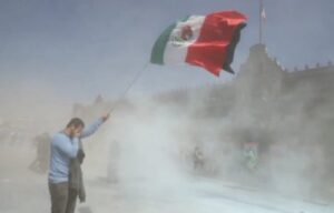 Ciudad de México, 15 de noviembre. Una imagen que no se olvidará. Un manifestante ondea la bandera de México en medio de una nube de gas que fue arrojada por la policía de Claudia Sheinbaum en el zócalo capitalino.