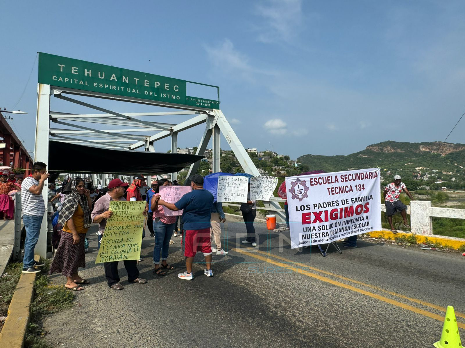 Tehuantepec, Oax. 3 de septiembre. Este martes, el comité de padres de familia junto con otros padres de la Escuela Secundaria Técnica No. 184, ubicada en la colonia El Jordán, realizaron un bloqueo en el emblemático puente de fierro de Tehuantepec.