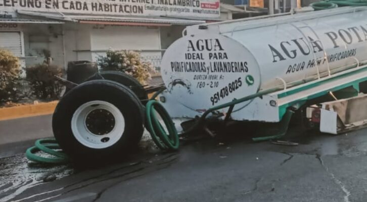 Oaxaca de Juárez, 12 de febrero. La falta de mantenimiento provocó que esta mañana una pipa de agua se quedara sin eje trasero sobre la calzada Héroes de Chapultepec frente al ADO con dirección al estadio Eduardo Vasconcelos.
