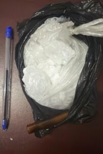 Tras esta inspección, las policías municipales detectaron en el interior de su mochila de color negro, una bolsa del mismo color, cuyo contenido era una sustancia granulada, con las características de la droga conocida como cristal; además, se le localizó en la bolsa de lado izquierdo de su pantalón de color azul, un pedazo de bolsa negro de nylon, que al interior tenía una sustancia granulada similar a la de la mochila.