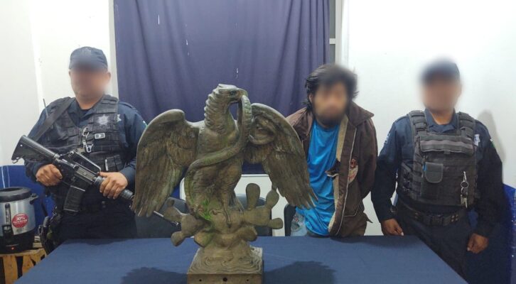 Debido a ello, procedieron a su detención, mismo que dijo llamarse Eleuterio M. C., de 33 años de edad, a quien le aseguraron el objeto, con figura de águila y una serpiente, al parecer de bronce de 60×40 centímetros.