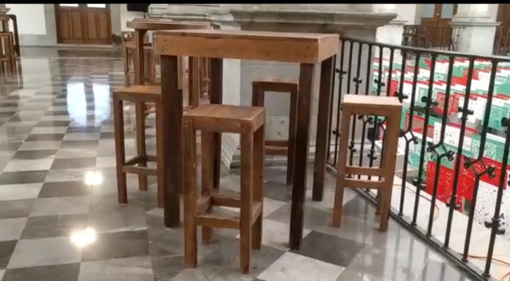 Mientras tanto al interior del Palacio se puede apreciar que se encuentra adornado con los colores patrios, varias mesas y sillas colocadas por meseros para tener todo listo para los invitados del gobernador, para ello en las calles aledañas no se están permitiendo el estacionamiento a los vehículos particulares.