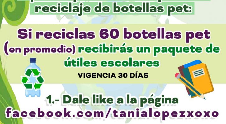 Señaló que los participantes deberán darle like a la página Facebook.com/tanialopezxoxo, y mandar un mensaje en modalidad inbox para realizar el registro correspondiente, “personal del DIF Municipal acudirá a los domicilios por el PET reciclado y hará entrega del paquete de útiles escolares”, expresó.