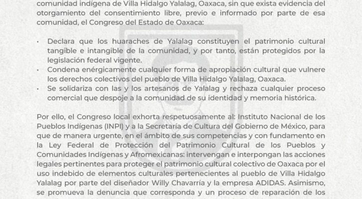 San Raymundo Jalpan, Oax. 7 de agosto. El Honorable Congreso del Estado de Oaxaca se pronunció en contra de la comercialización del calzado denominado “Oaxaca Slip-On” de la empresa transnacional ADIDAS y Willy Chavarría, el cual reproduce elementos característicos del diseño de los huaraches tradicionales de la comunidad indígena de Villa Hidalgo Yalalag, Oaxaca.