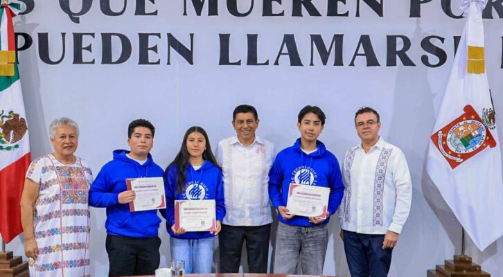 Oaxaca de Juárez, 12 de agosto. En el marco del Día Internacional de la Juventud, el Gobernador Salomón Jara Cruz entregó reconocimientos a seis estudiantes provenientes de distintas regiones del estado quienes, con mérito académico y acciones de impacto social, obtuvieron una beca en el Instituto Tecnológico y de Estudios Superiores de Monterrey.