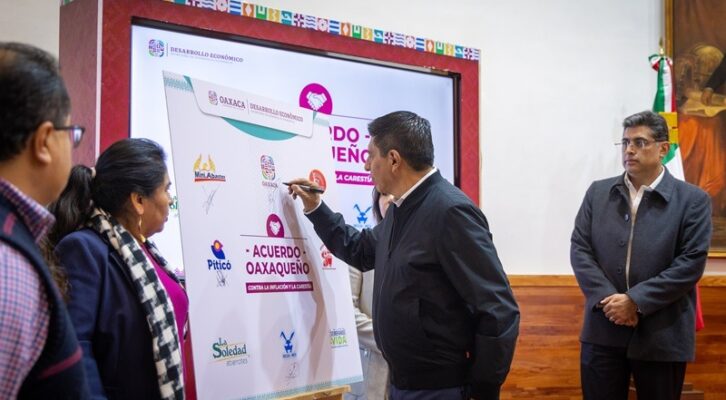 Oaxaca de Juárez, 9 de diciembre. En un esfuerzo conjunto por apoyar la economía de las familias, el Gobernador Salomón Jara Cruz firmó con el sector primario del programa Sembrando Vida y principales cadenas abarroteras mayoristas locales, el Acuerdo Oaxaqueño contra la inflación y la carestía, que establece el precio de la canasta básica de la entidad en 910 pesos.