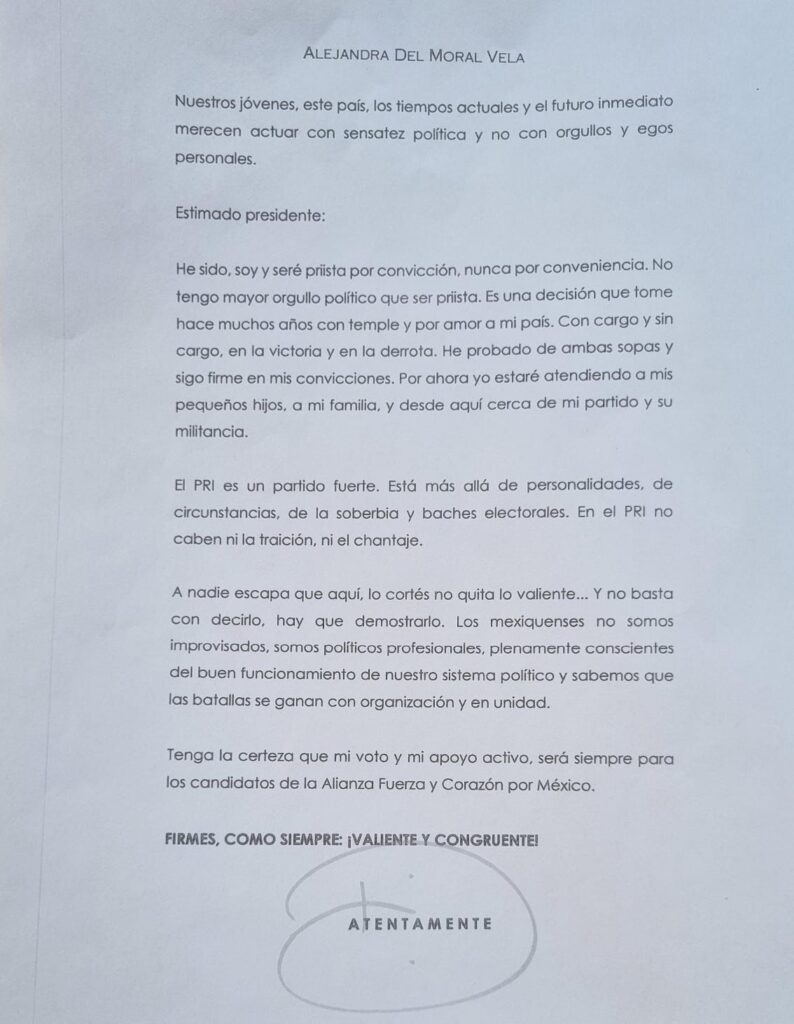 Oaxaca de Juárez, 20 de febrero. Dirigió una carta al presidente del partido Alejandro Morena. No renuncia al PRI, sino deja su lugar a otra mujer.