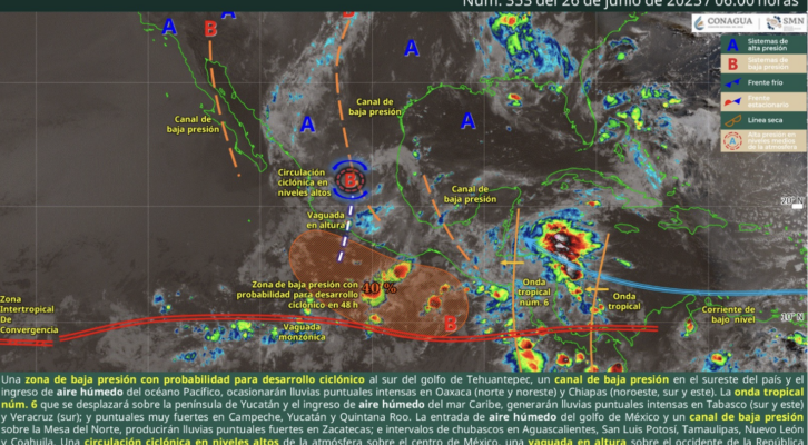 De acuerdo con el pronóstico del tiempo emitido por la Comisión Nacional del Agua (Conagua), todas estas condiciones se deben al flujo de humedad que impulsa la vaguada monzónica, un canal de baja presión sobre el sureste de México, con potencial alto para desarrollo ciclónico a siete días, ubicado al sur de Guatemala y México, y el ingreso de la onda tropical número 6 sobre el sureste.