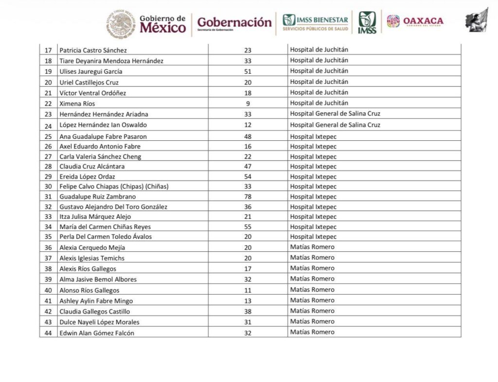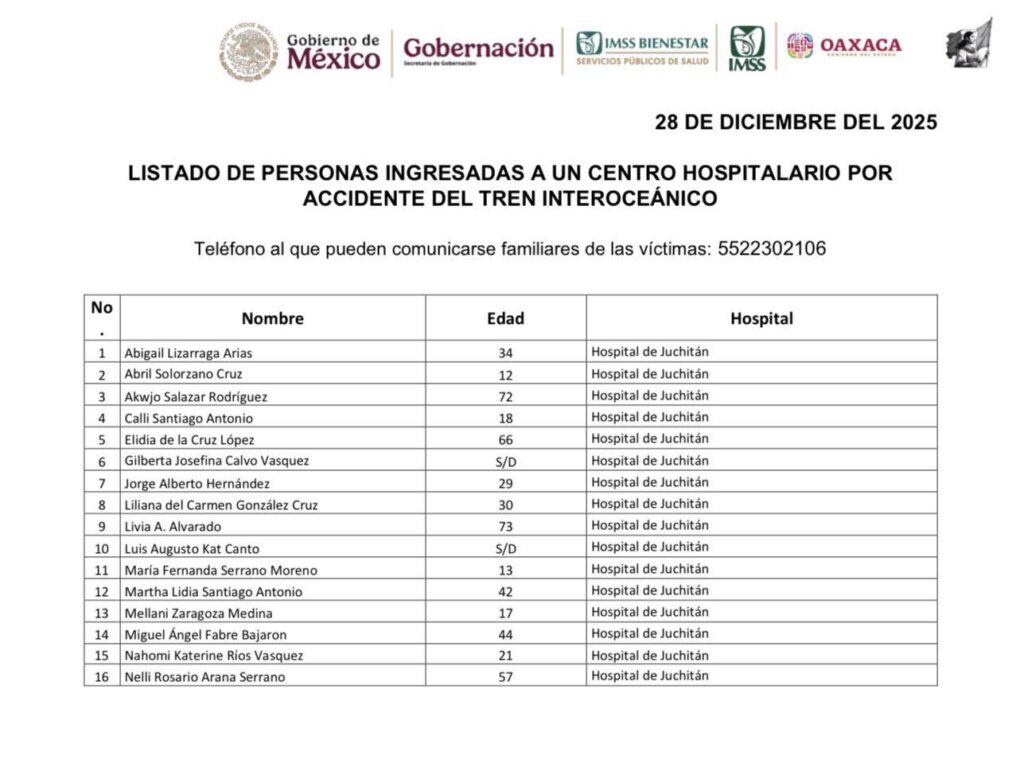 Oaxaca de Juárez, 28 de diciembre. La secretaría de Gobernación emitió esta noche una nueva lista de nombres de pasajeros que resultaron lesionados en el descarrilamiento del tren Interoceánico en el Istmo de Tehuantepec.