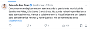 La información del asesinato de García Soto, fue confirmada por el gobernador Salomón Jara Cruz a través de su cuenta de X, Antes Twitter, quien condenó enérgicamente los hechos “Condenamos enérgicamente el asesinato de la presidenta municipal de San Mateo Piñas, Lilia Gema García Soto”
