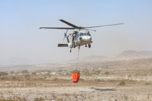 Oaxaca de Juárez, 24 de mayo. El Gobierno de Oaxaca a través de la Comisión Estatal Forestal (Coesfo) informa que este viernes se sumó el helicóptero tipo UH-60 de la Secretaría de la Defensa Nacional (Sedena) a las labores de liquidación del incendio en Tepelmeme Villa de Morelos.