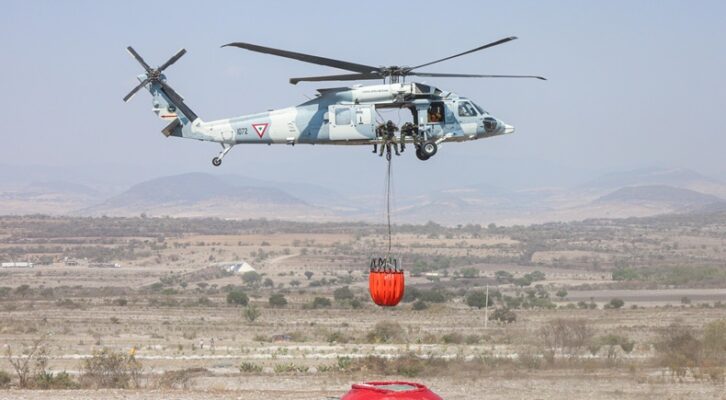 Oaxaca de Juárez, 24 de mayo. El Gobierno de Oaxaca a través de la Comisión Estatal Forestal (Coesfo) informa que este viernes se sumó el helicóptero tipo UH-60 de la Secretaría de la Defensa Nacional (Sedena) a las labores de liquidación del incendio en Tepelmeme Villa de Morelos.