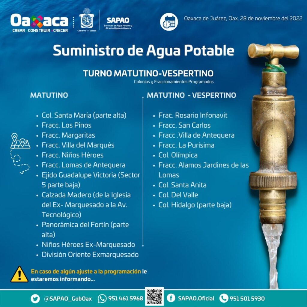 Oaxaca de Juárez, 28 de noviembre. Conoce el suministro de agua potable del lunes 28 de noviembre de 2022 en el turno matutino-vespertino.